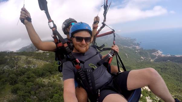Paragliding – For this, we got picked up outside a hotel and driven to the top of the surrounding cliffs, with our guide/pilot. Scott ran off the cliff first to tick off his bucket list, and I was left to stand up on the top of the cliff on my own and wait for my pilot to come in the next car. Two or three different groups of paragliders came and went before mine turned up (which wasn’t fun as I had no phone, no water and no idea how to get back into town had I needed to!). I really loved the feeling of ‘floating’ down through the air, but Scott wasn’t quite as keen. It made his tummy feel a bit funny, especially when he started doing tricks over the sea! This might have just been down to the fact that we were told to only have a light snack before hand, so what did we do? Sit down to a 2 course meal of whitebait and dumplings, followed by large portions of stodgy carb-enriched pasta. Whoops..
